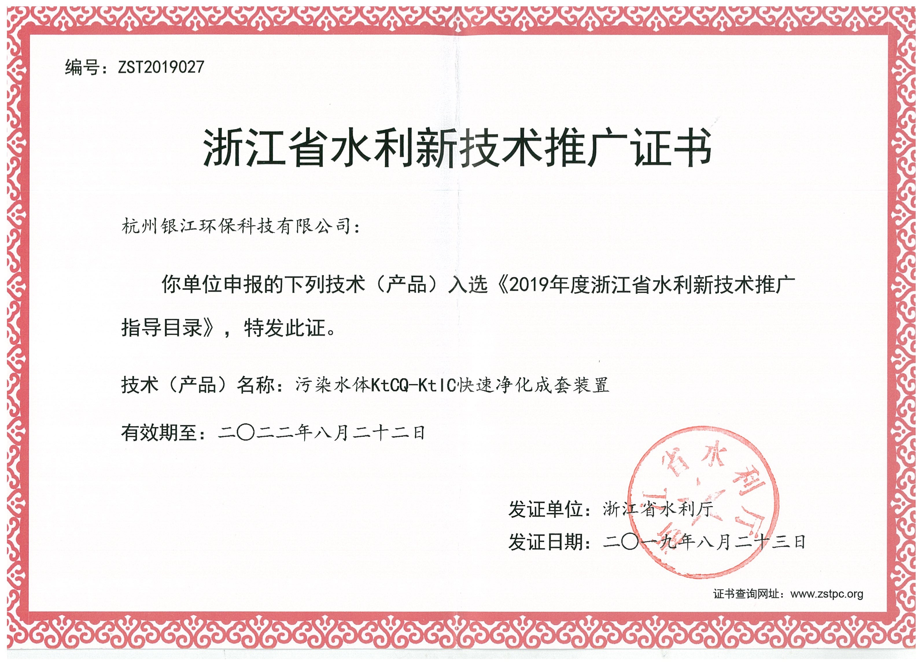 浙江省水利先進(jìn)適用技術(shù)(產(chǎn)品)推廣證書