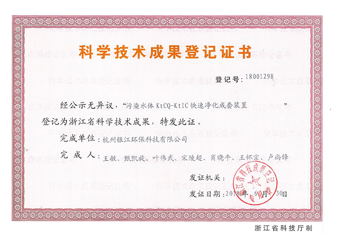 銀江環(huán)保“污染水體KtCQ-KtIC快速凈化成套裝置”登記為浙江省科學(xué)技術(shù)成果。