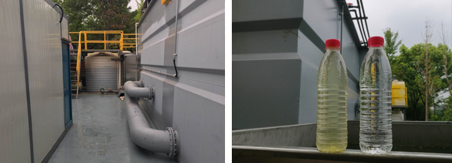 十號河位于杭州市江干區(qū),北起余杭區(qū)界,向南流入和睦港,全長1762米,河面寬度5-100米,平均水深約2.3米,河道水體容量約10萬立方。2015年,該河道已進行了生態(tài)治理和養(yǎng)護工程,目前河道水體中藻類較多,水質(zhì)總磷超標,屬于劣五類水,且水體顏色呈“棕綠色”,水面有大量的水綿等漂浮物,嚴重影響河道的生態(tài)景觀效果。 該項目采用了一套5000噸/天的KtLM濾膜一體機進行河道水質(zhì)提升,出水達到Ⅳ類水標準。
