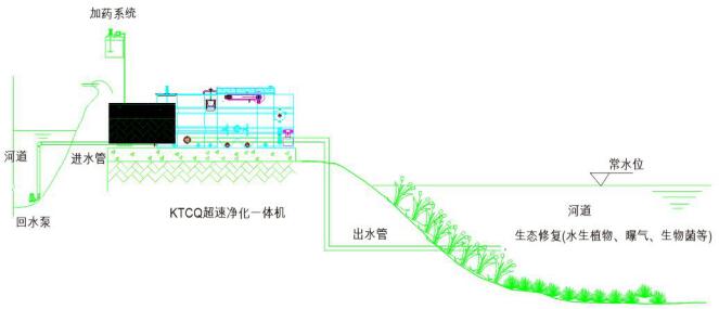基于高效復合絮凝水體物理處理技術,表面負荷達到30m3/m2·h,具有除磷脫氮技術。處理水量大,設備占地小、可移動,是一種快速物化處理技術,解決大流量污水入河問題。用于大水量的雨污混流排放口及河道水循環(huán)快速處理。主要指標SS去除90%以上,COD、TP去除60%及部分氨氮,是當下消劣利器。