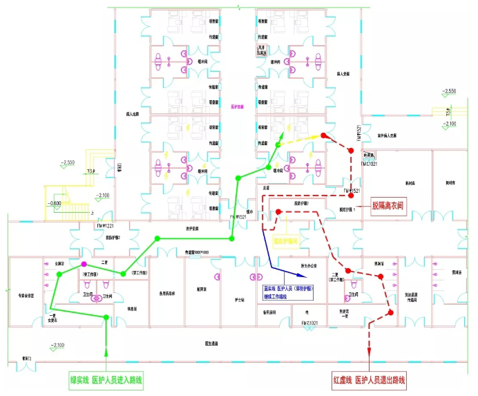 火神山醫(yī)院醫(yī)療設(shè)施按傳染病醫(yī)療流程進(jìn)行布局,且根據(jù)新型冠狀病毒感染的肺炎傳染病治療流程進(jìn)一步細(xì)化功能分區(qū)?;痉謪^(qū)為清潔區(qū)、限制區(qū)(半清潔區(qū))、隔離區(qū)(半污染區(qū)和污染區(qū)),相鄰區(qū)域之間設(shè)置相應(yīng)的衛(wèi)生通過(guò)或緩沖間。醫(yī)護(hù)人員進(jìn)入及退出流線如圖3所示。