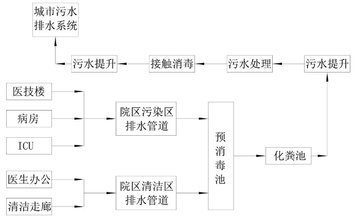 火神山醫(yī)院屬于新型冠狀病毒感染的肺炎傳染病醫(yī)院,按照GB50849《傳染病醫(yī)院建筑設(shè)計(jì)規(guī)范》第6.4.2條,“醫(yī)技、病房和ICU病房的污水應(yīng)先排人化糞池,滅活消毒后應(yīng)與廢水一同進(jìn)入醫(yī)院污水處理站,并應(yīng)采用二級(jí)生化處理后再排人城市污水管道。”GB18466《醫(yī)療機(jī)構(gòu)水污染物排放標(biāo)準(zhǔn)》第4.1.1條規(guī)定“傳染病醫(yī)療機(jī)構(gòu)污水排放一律執(zhí)行表1的規(guī)定”。