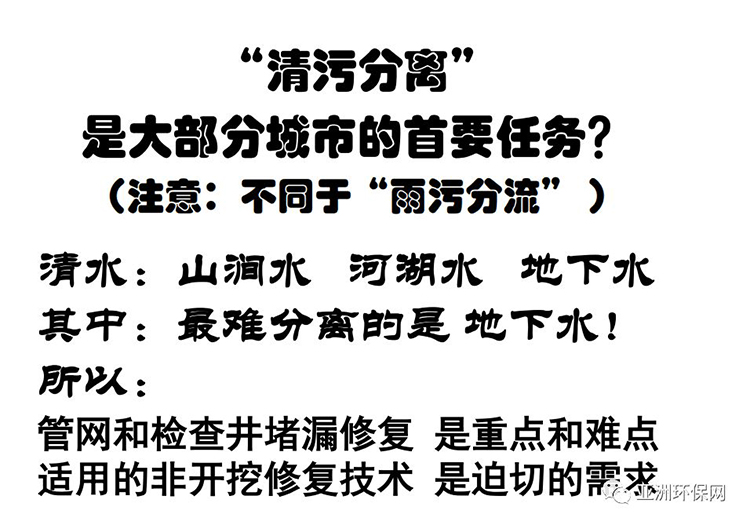 “清水包括山澗水、河湖水、地下水。檢測證明,大量是從管網(wǎng)漏進(jìn)來的。特別是地下水,量大面廣最難分離,因此,管網(wǎng)和檢查井堵漏修復(fù)是重點和難點,對適用的非開挖修復(fù)技術(shù)需求迫切?!睆垚偙硎?,對于地下水必須真刀實槍下功夫。不能做躲了這一代,難題留給下一代的事兒。