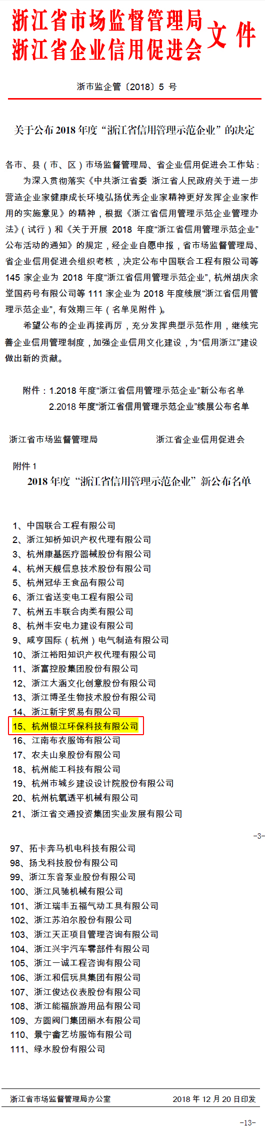 銀江環(huán)保榮獲2018年度“浙江省信用管理示范企業(yè)”發(fā)布日期:2018-12-21