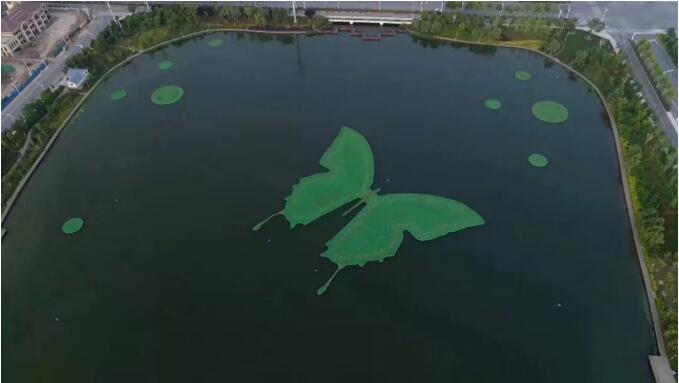在彩蝶湖內(nèi)部設(shè)置生態(tài)浮島約6000平方,其中大型彩蝶浮島總面積約為3500平方,其余圓形浮島共約2500平方,同時在彩蝶湖內(nèi)設(shè)置12臺噴泉曝氣機,對彩蝶湖進行增氧曝氣,提升彩蝶湖整體景觀效果