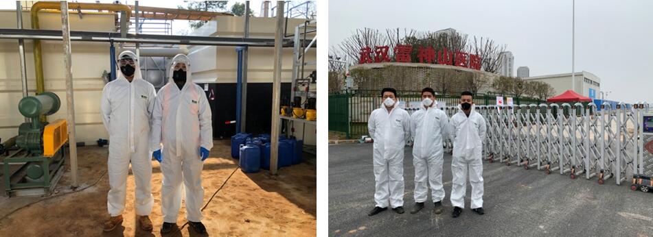 方明:雷神山項目安裝完畢后調(diào)試設(shè)備的時候,生化系統(tǒng)曝氣總是不正常,開了風機以后生化池調(diào)料總是沒有反應(yīng),也調(diào)整了所有閥門的開關(guān)度,檢查了整個曝氣管路的安裝情況,兩臺風機同時啟動,能想的辦法都想過了,生化箱體的填料就是沒反應(yīng),那幾天付宇和李成峰連著熬了4天,每天累了就在車上躺一下,整個系統(tǒng)都安裝好了,曝氣又出現(xiàn)問題,而且試了各種方法都不管用,當時他們已經(jīng)累得趴了,但任務(wù)緊急必須在7號前調(diào)試完成,我也從火神山過去支援,一起想辦法處理曝氣系統(tǒng)的問題,最后改了兩個箱體內(nèi)部的曝氣管道才使曝氣系統(tǒng)正常。