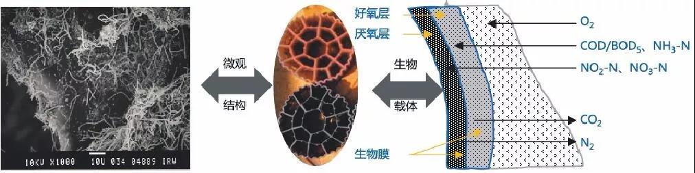 KtIC一體化污水處理設(shè)備,采用多級式MBBR & SBBR組合工藝,結(jié)合國內(nèi)外先進的高效溶氧裝置、高效流化傳質(zhì)系統(tǒng)與均質(zhì)布水系統(tǒng),通過培育附著在比表面積超過800 m2/m3的BIO-FORM®納米生物載體上的混合兼性菌種,構(gòu)成BIO-NET生態(tài)系統(tǒng)。其以革蘭氏陽性芽孢桿菌(Bacillussubtilhls)為主、光合細菌 (Photosyntheticbacteria)、硝化、反硝化細菌等混合菌劑為輔的高效菌體,高效降解污/廢水中的總氮、 COD及氨氮等污染物,具有高效、耐沖擊、施工簡便、占地少等技術(shù)優(yōu)勢。
